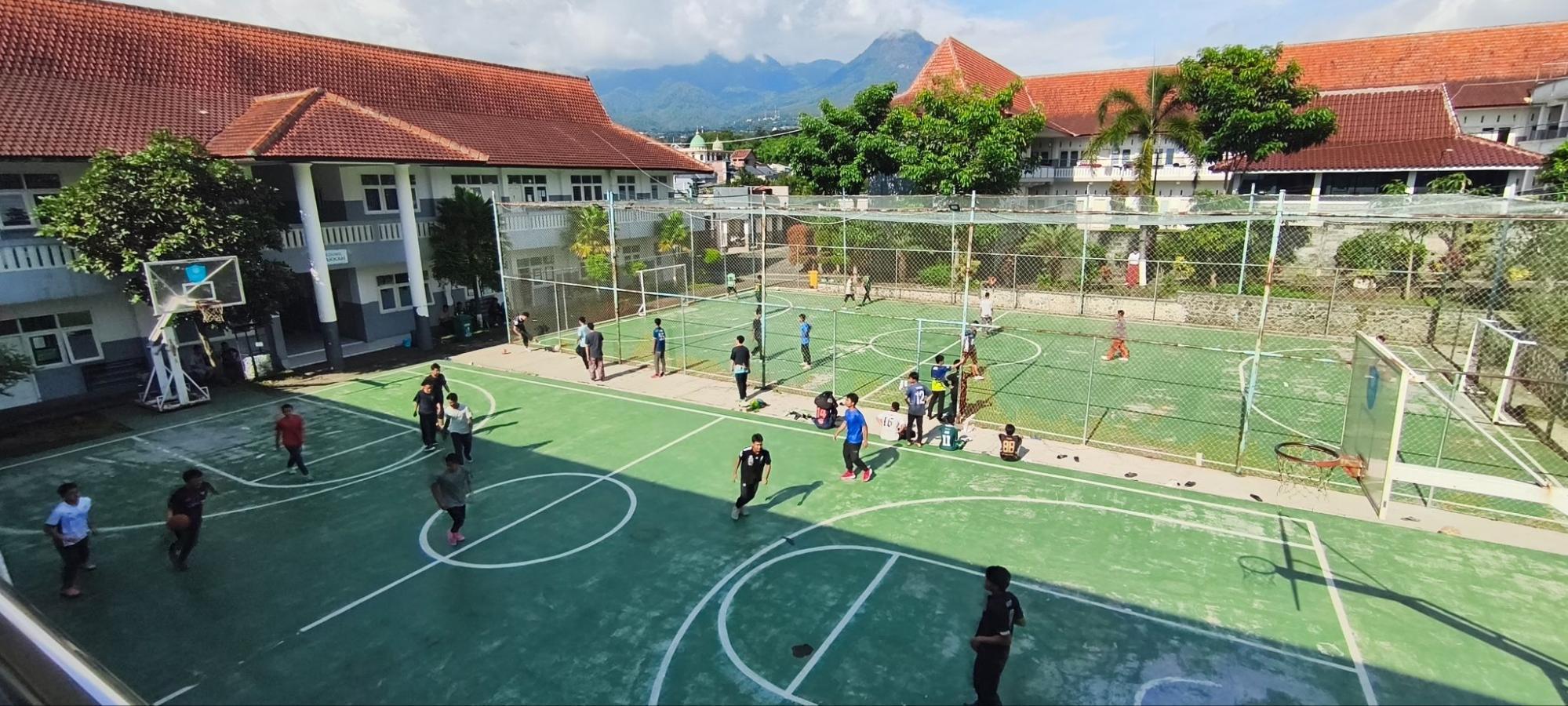 Di lapangan futsal, para santri tampak bersemangat mengikuti pertandingan persahabatan. Sementara itu, di sisi lain lapangan, kelompok santri lain bermain basket dengan penuh sportivitas. Kegiatan badminton dan tenis meja juga tak kalah ramai, menghadirkan suasana kompetitif namun tetap ceria.